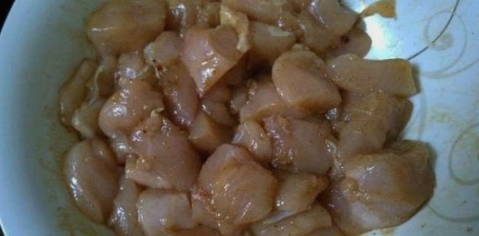 - Giet de geurige donkere marinade bij de kipblokjes en meng alle ingrediënten goed door elkaar.