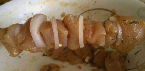 - We zetten kipblokjes en uienringen op houten spiesen - afwisselend.