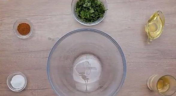 - Een geurige dressing bereiden. Meng in een blenderkom fijngehakte peterselie, witte wijn, plantaardige olie en kruiden naar wens.
