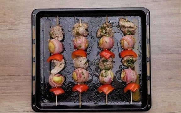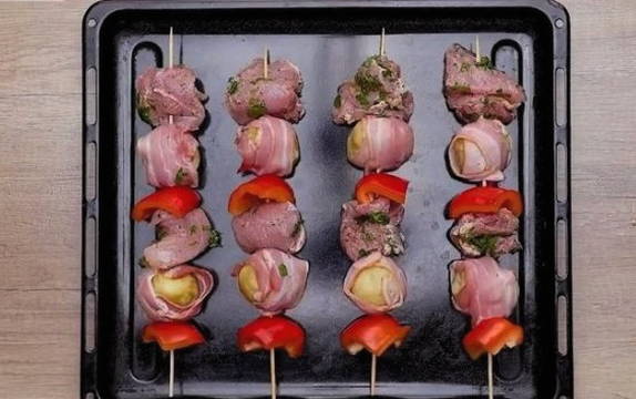 - We verzamelen kebab. We rijgen varkensvlees, een plakje paprika, aardappelen in spek op houten spiesen en herhalen. Verspreid op afstand van elkaar op een bakplaat.