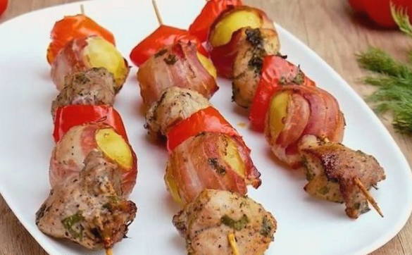 Een volwaardig warm gerecht meteen met een bijgerecht is een prima optie voor een huisgemaakt diner of barbecue in de natuur. Sappig varkensvlees, samen met kleine aardappelen omwikkeld met spek, zullen vleeseters zeker aanspreken. Zoete paprika brengt zijn eigen smaak en "verlicht" het gerecht.