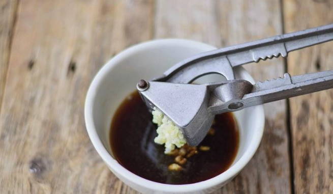 - Voeg knoflook toe aan de dressing, door een pers gehaald of zo fijn mogelijk gehakt.