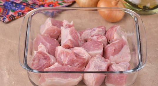 Spoel het varkensvlees grondig onder stromend water, droog het af met keukenpapier en snijd het in voldoende grote stukken (terwijl witte films en strepen worden verwijderd).