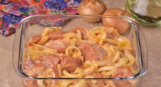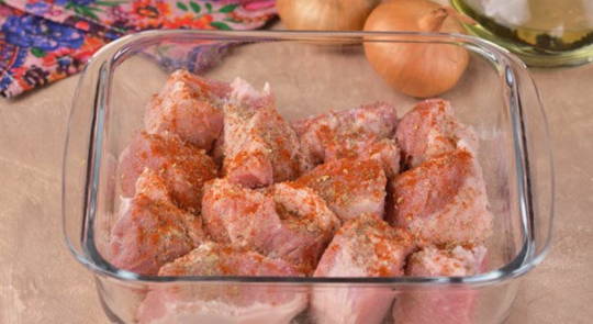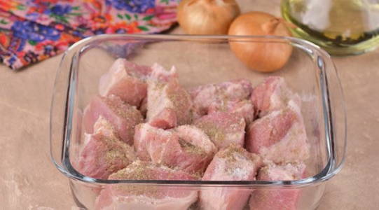 - Spoel het varkensvleespulp goed af onder stromend water, droog het en snijd het in stukken van maximaal 5 bij 5 centimeter. Snijd de ui in ringen die dik genoeg zijn en stuur deze naar het vlees, besprenkel het royaal met je favoriete kruiden, zout, peper en zet opzij om minstens een uur in je eigen sap te marineren.