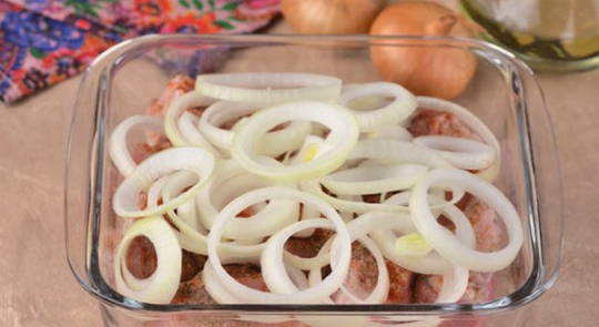 - Sappige kebab op een uienkussen in de oven
