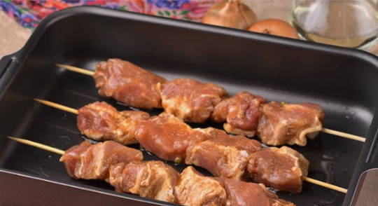 - We weken de spiesen vooraf in koud water en leggen er een stuk vlees, ui en opnieuw vlees op - we wisselen af.