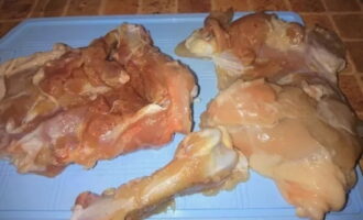 Neem de benodigde hoeveelheid kippenvlees. Deze keer heb ik kippenpoten gebruikt.