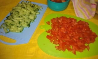 Was en droog de tomaten en komkommers grondig. Snijd de tomaten in middelgrote blokjes. Snijd de komkommers in dunne reepjes.