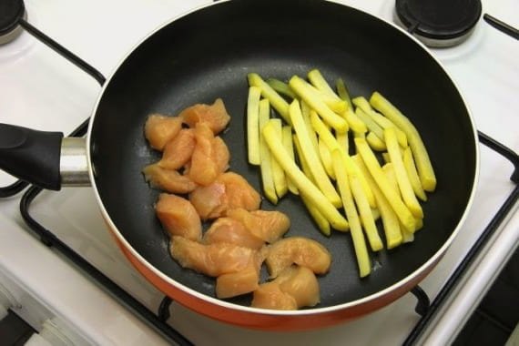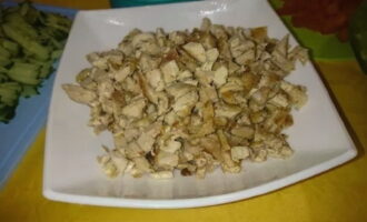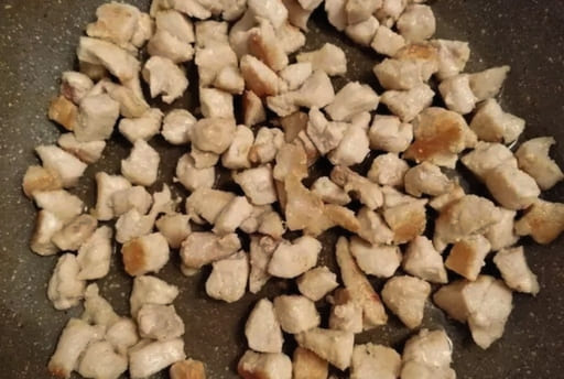 - Snijd het gebakken kippenvlees in kleine stukjes.
