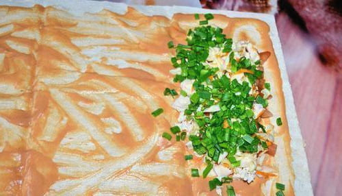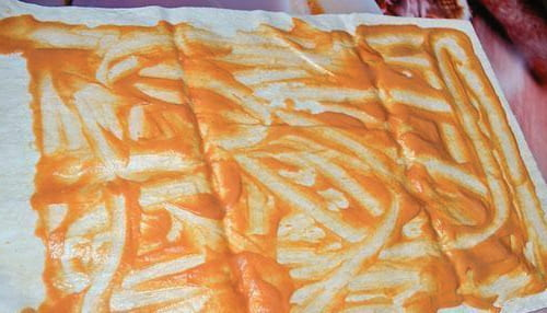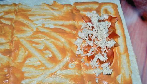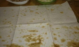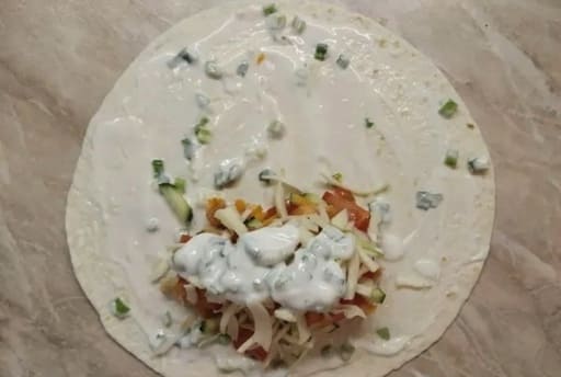 - Combineer tomatenpuree met mayonaise en meng grondig tot een gladde massa. Spreid een vel pitabroodje uit op een schoon werkvlak. En bestrijk het met de voorbereide saus en verdeel het gelijkmatig over het hele oppervlak.