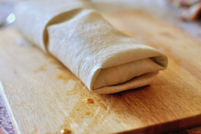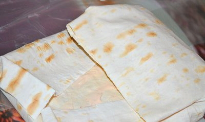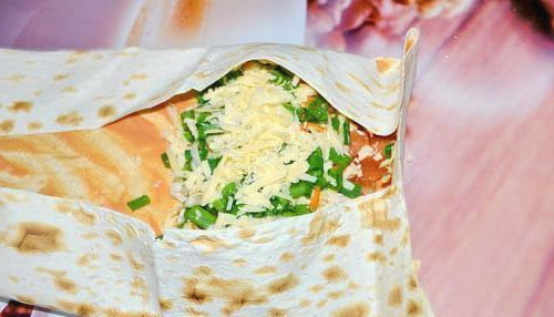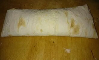 - Rol de vrije randen van het pitabroodje naar het midden. Rol de lavash strak in een envelop.