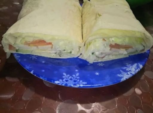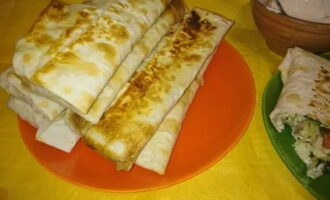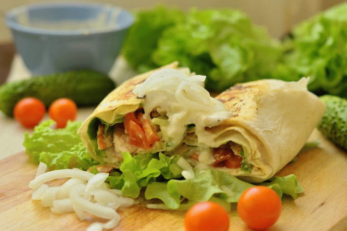 - Verhit de koekenpan waarin de kip is gebakken en bestrijk met een kleine hoeveelheid plantaardige olie, leg de shoarma-naad naar beneden en bak aan beide kanten goudbruin op minimaal vuur. Serveer kant-en-klare dieetshoarma met kip zonder mayonaise.