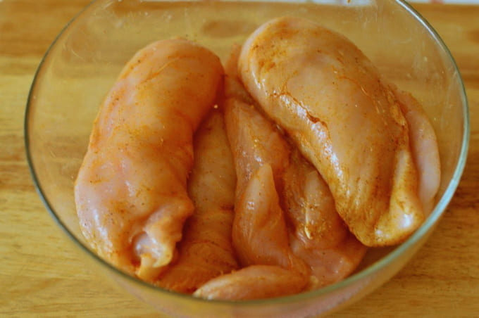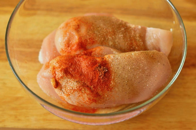 - Spoel de kipfilet grondig onder koud stromend water, dep droog met keukenpapier en doe in een diepe bak. Breng op smaak met zout en zwarte peper en kruiden naar smaak.