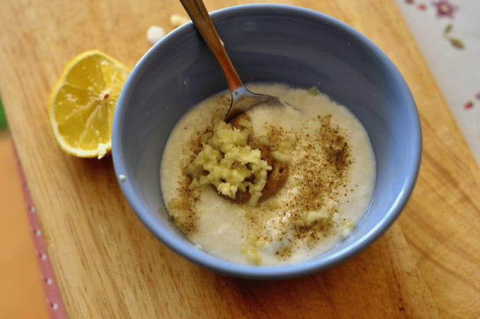 - Bereid de saus voor. Combineer natuurlijke yoghurt en mosterd in een kleine kom. Pel de knoflook en passeer door een pers in de saus, zout en voeg kruiden en zwarte peper naar smaak toe, evenals citroensap. Meng grondig tot een gladde massa.