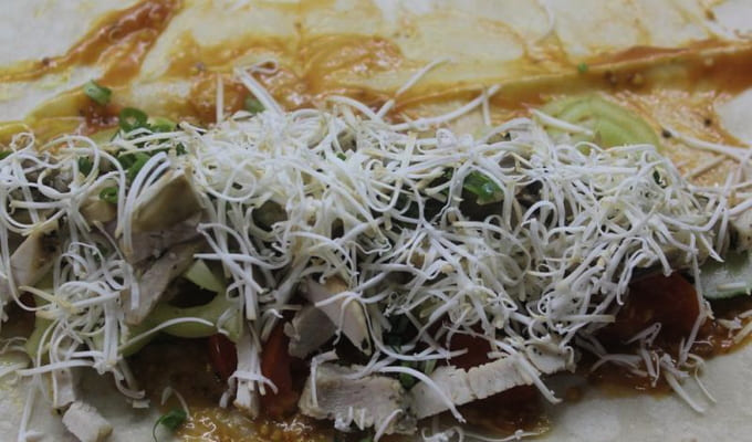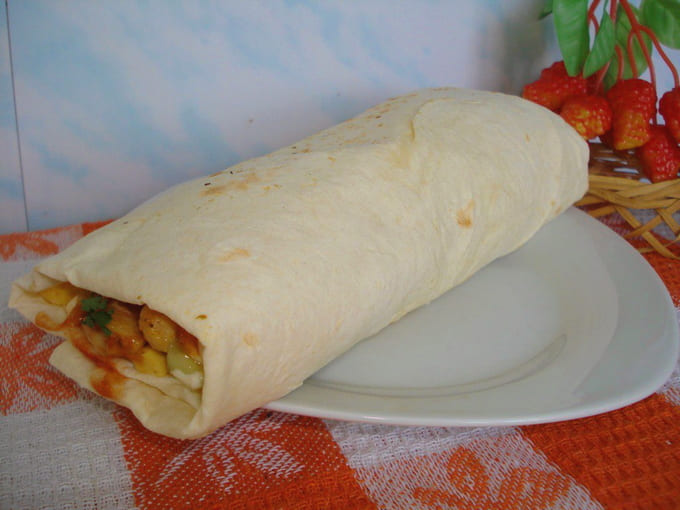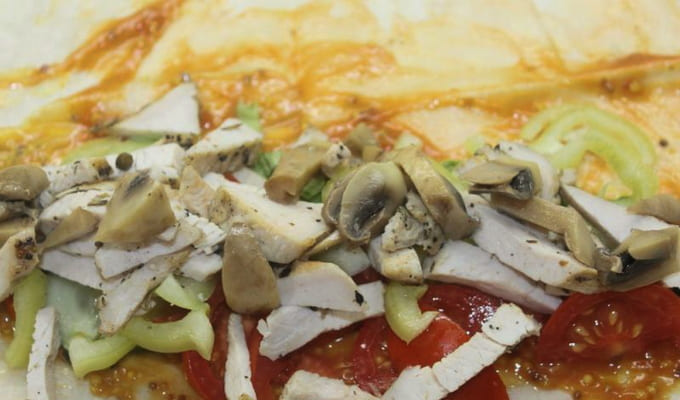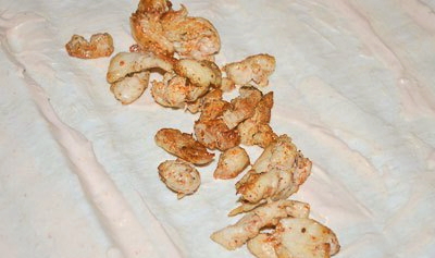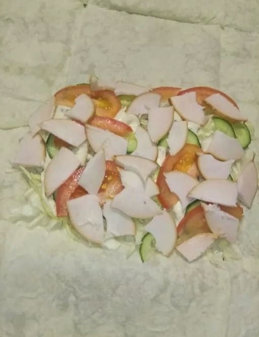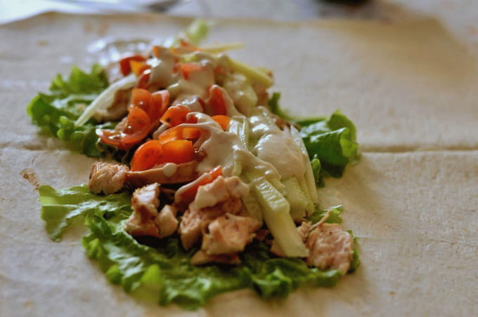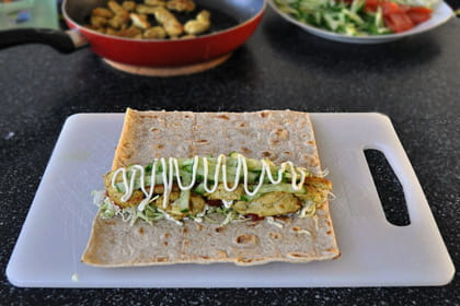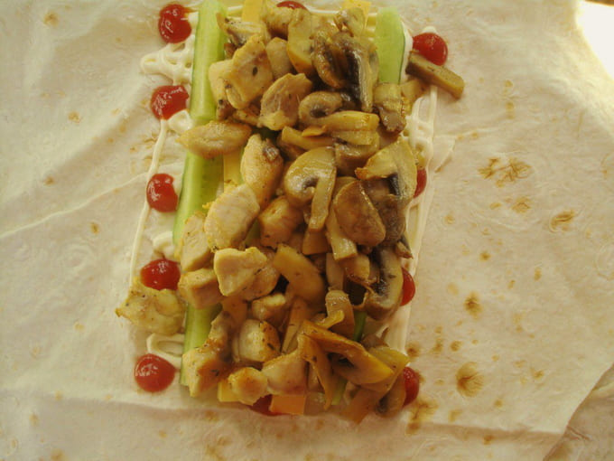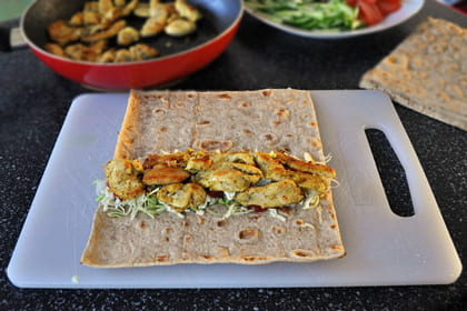 - Spreid een vel pitabroodje uit op een schoon werkvlak van de tafel en bestrijk het met de voorbereide saus. Schik de gebakken kip en groenten, top met de saus.