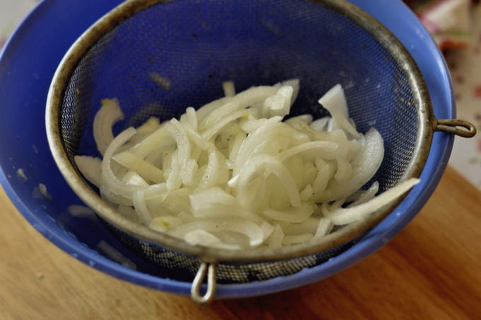 - Schil de uien, spoel ze af onder koud stromend water, snijd ze in halve ringen en overgiet ze met vooraf bereid kokend water om de onaangename bitterheid te verwijderen. Doe vervolgens in een zeef om het overtollige vocht in het glas te houden. Voeg de ui toe aan de shoarma.