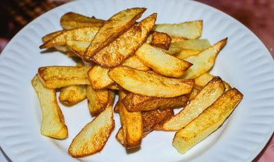 - Spoel de kipfilet goed af in water, droog af met keukenpapier en snijd in kleine stukjes. Breng op smaak met zout en kipkruiden. Verhit een koekenpan op middelhoog vuur. Bestrijk met een beetje plantaardige olie, leg de kip en de bevroren frietjes neer en bak ze goudbruin.