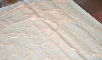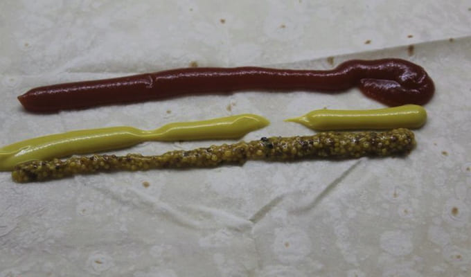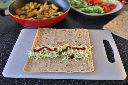 - Spreid een vel pitabroodje uit op een schoon werkvlak. Schik de witte kool en bestrijk licht met ketchup.