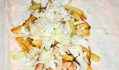 - Snijd de witte kool fijn en leg deze op de aardappelen.