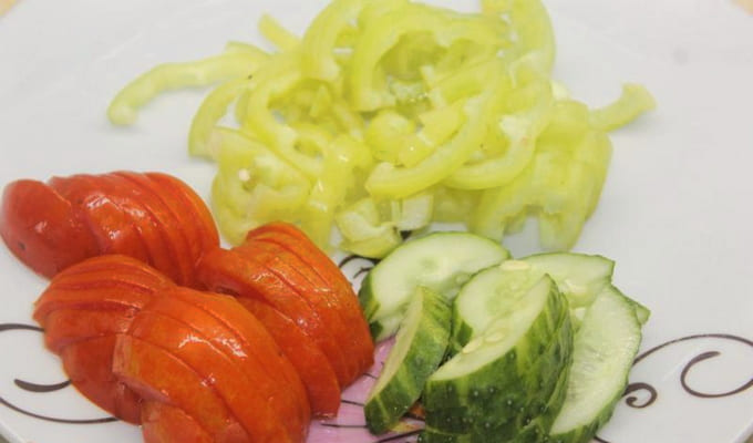 - Was en droog de tomaten, paprika's en komkommers grondig. Snijd de tomaten en komkommers in halve maantjes. Schil de paprika van de zaden en het klokhuis en snijd in halve ringen.