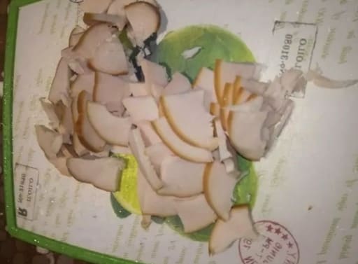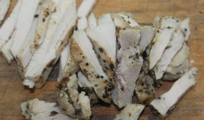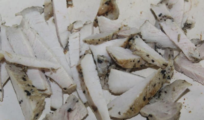 - Schil de gerookte kipfilet en snij in dunne plakjes.