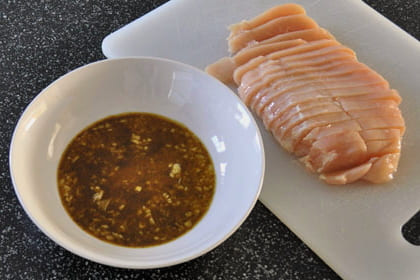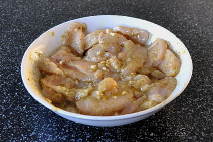 - Spoel de kipfilet in koud water, dep droog met keukenpapier en snijd in dunne plakjes. Bereid de marinade voor. Giet de benodigde hoeveelheid citroensap en olijfolie in een diepe kom. Breng op smaak met zout en zwarte peper en kruiden naar smaak. Pel de knoflook en passeer door een pers in de marinade.