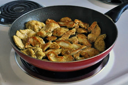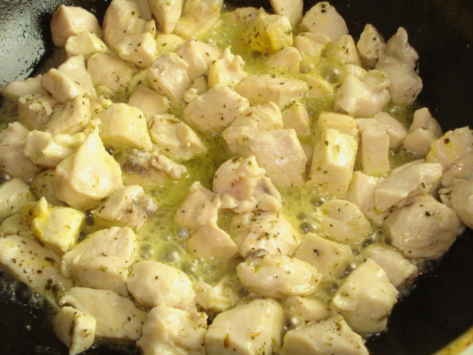- Spoel de kipfilet goed af in koud water, dep droog met keukenpapier en snijd in kleine stukjes. Breng op smaak met zout en kipkruiden. Verwarm de koekenpan goed op middelhoog vuur. Bestrijk met een beetje plantaardige olie, leg de kip neer en bak goudbruin.