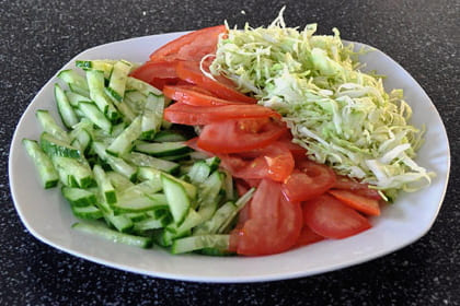 - Was en droog de tomaten en komkommers grondig. Snijd de tomaten in dunne plakjes. Snijd de komkommer en kool in dunne reepjes.