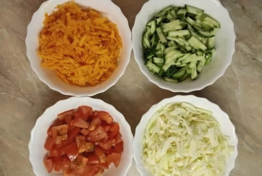 - Was en droog de tomaten en komkommers grondig. Snijd de tomaten in middelgrote plakjes. Snijd de komkommer en kool in dunne reepjes. Schil de wortelen met een dunschiller en rasp ze op een grove rasp.