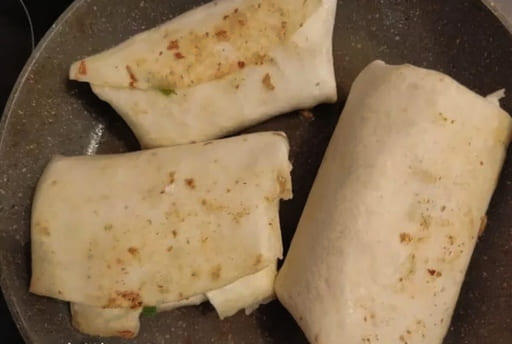 - Rol het pitabroodje stevig op met een envelop en bak vervolgens aan beide kanten in een droge koekenpan goudbruin.