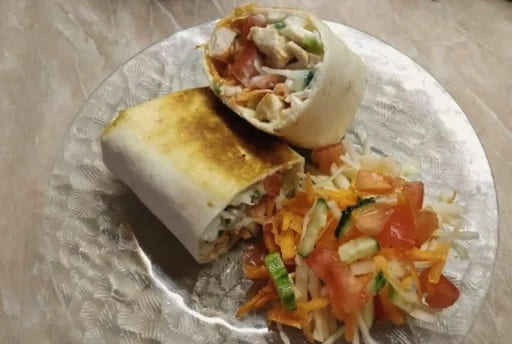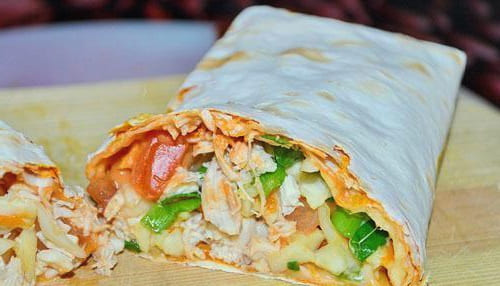 - Huisgemaakte shoarma met kip, komkommer en tomaat