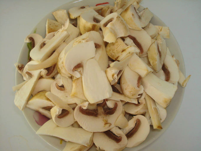 - Schil de champignons, snijd ze in dunne plakjes en bak ze in een goed verwarmde koekenpan ingevet met een beetje plantaardige olie.