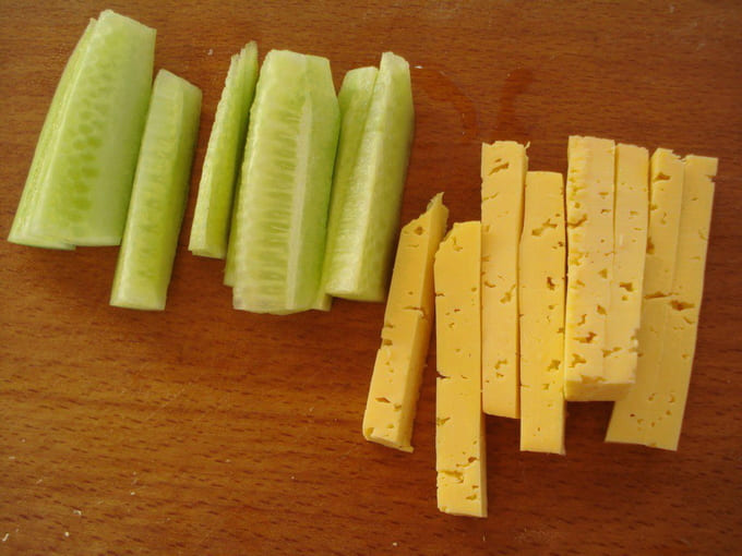 - Was en droog de komkommers grondig, schil ze met een dunschiller en snijd ze in reepjes. Snijd ook de harde kaas in reepjes.