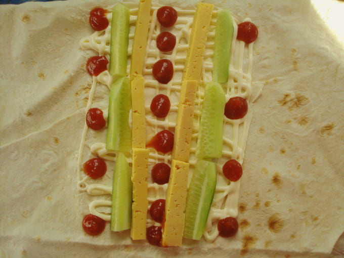 - Spreid een vel pitabroodje uit op een schoon werkvlak. Bestrijk met een beetje mayonaise en ketchup. Schik de plakjes kaas en komkommer.