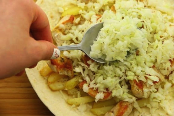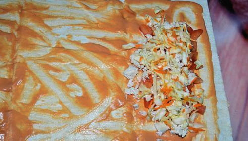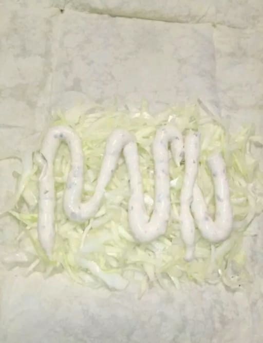 - Spreid een vel pitabroodje uit op een schoon werkvlak. Doe gehakte witte kool, bestrijk met champignonsaus.