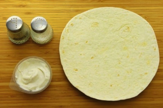 - Spreid een vel pitabroodje uit op een schoon werkvlak. Bestrijk met de voorbereide saus en verdeel deze gelijkmatig over het hele oppervlak.