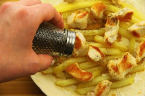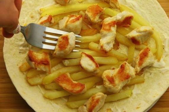 - Serveer de afgewerkte shoarma met kip en aardappelen.
