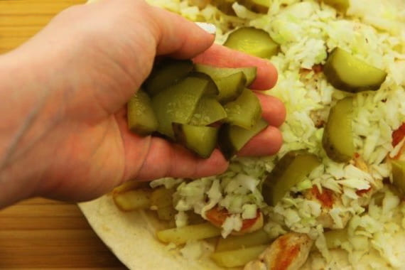 - Snijd de ingelegde komkommer in dunne plakjes en leg deze op de kool.