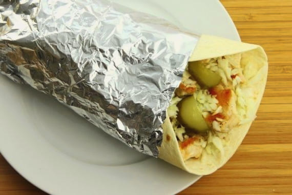 - Rol het pitabroodje stevig op en wikkel het in folie zodat de vulling er niet uit valt.