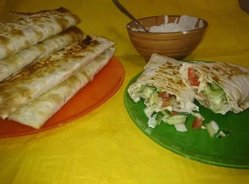 - Huisgemaakte shoarma met kip, komkommer en tomaat