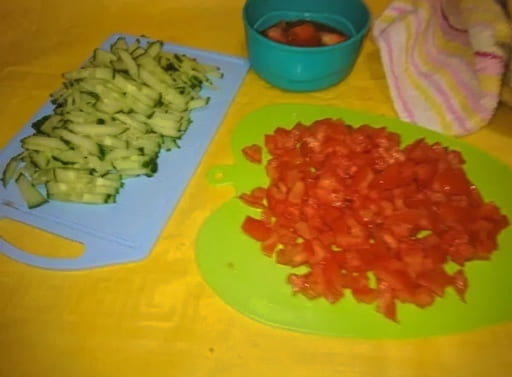 Was en droog de tomaten en komkommers grondig. Snijd de tomaten in middelgrote blokjes. Snijd de komkommers in dunne reepjes.