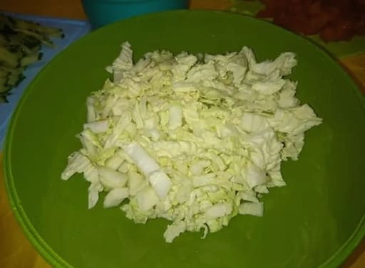 - Snijd de witte kool in middelgrote reepjes. En kneed dan met je handen om het zachter en sappiger te maken.