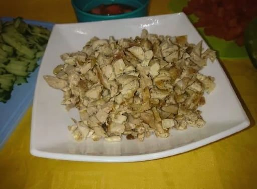 - Snijd het gebakken kippenvlees in kleine stukjes.