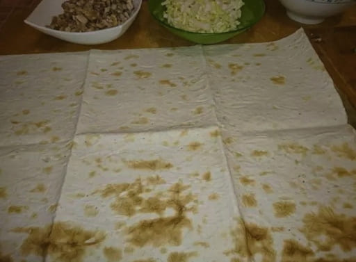 - Spreid een vel pitabroodje uit op een schoon werkvlak. Doe gehakte witte kool, bestrijk met champignonsaus.