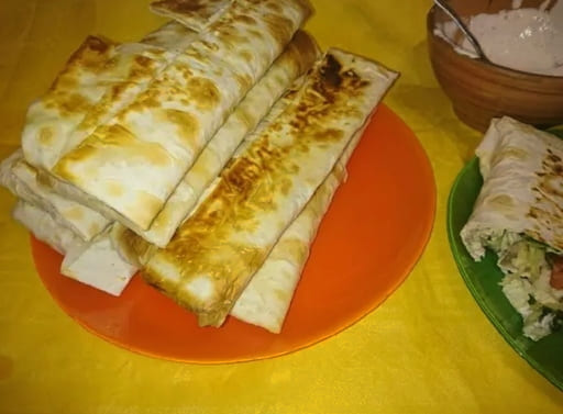 - Spreid een vel pitabroodje uit op een schoon werkvlak van de tafel en bestrijk het met de voorbereide saus. Schik de gebakken kip en groenten, top met de saus.