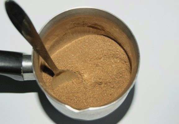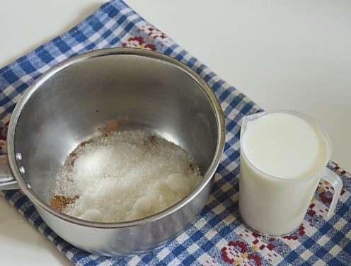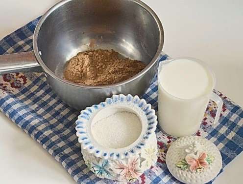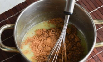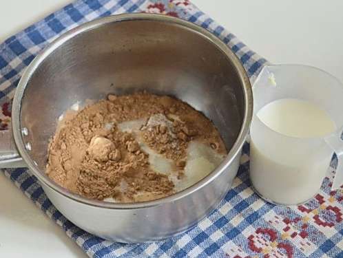 - Doe cacao en twee soorten suiker in een kleine steelpan of kookpan.