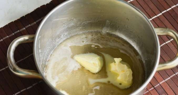 - Dompel vervolgens de boter in het mengsel en blijf roeren tot een gladde massa. We verwijderen van de kachel.