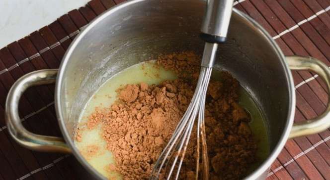 - Doe cacao en twee soorten suiker in een kleine steelpan of kookpan.