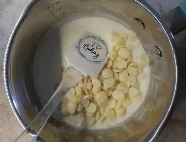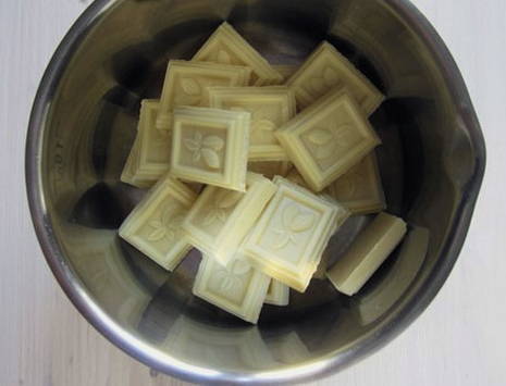 - Breek 2 tegels witte melkchocolade in kleine blokjes en laat sudderen in een waterbad, onder voortdurend roeren.