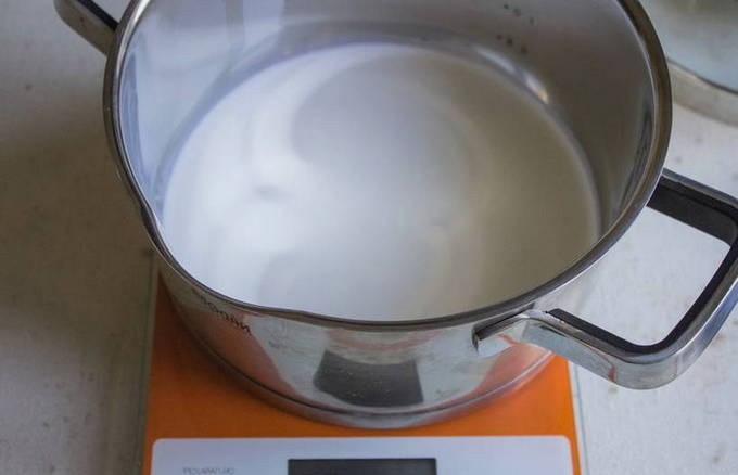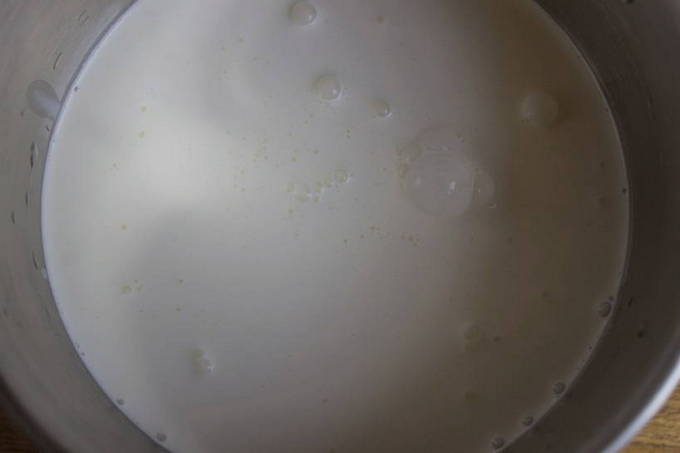 - Giet zware room in een pan en breng aan de kook op laag vuur. Zodra de eerste luchtbellen verschijnen, onmiddellijk van het fornuis halen.